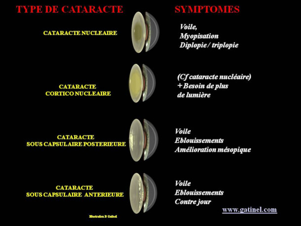 Certain médicaments sont choisis en fonction de la topographie et de la morphologie des opacités ; on distingue trois types de cataractes partielles :